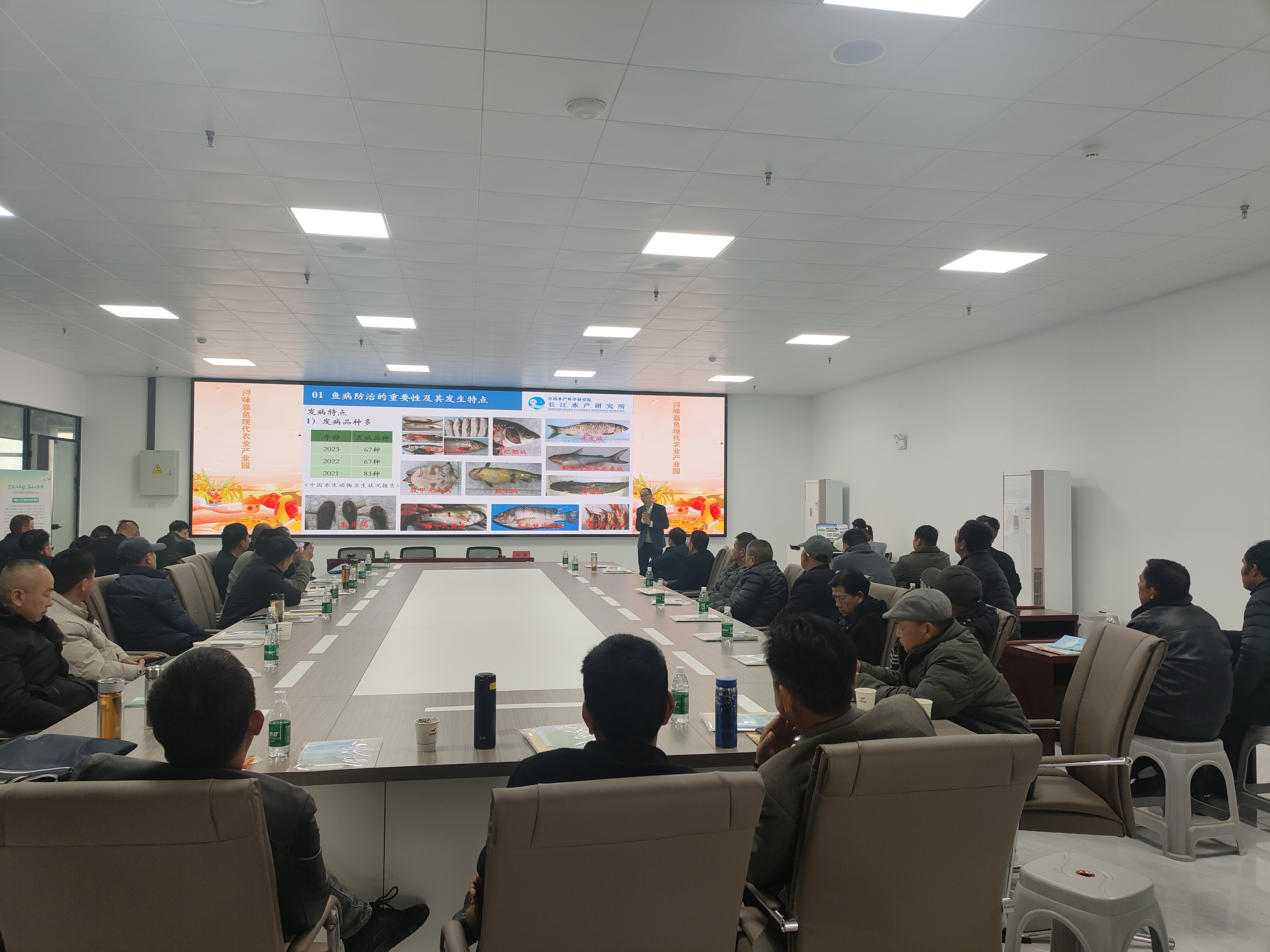 本次培训紧扣嘉鱼县产业发展需求和春季水产养殖生产实际设置课程内容。湖北省水产技术推广总站汤亚斌研究员围绕稻虾高效养殖新模式,从模式特点、产量、利润、技术要点等方面进行了系统讲解。长江水产研究所周勇研究员聚焦鱼病防控与精准用药关键技术,讲解了春季鱼病发生原因、常见鱼病种类、防治误区和精准用药关键技术,内容极具实用性和针对性。