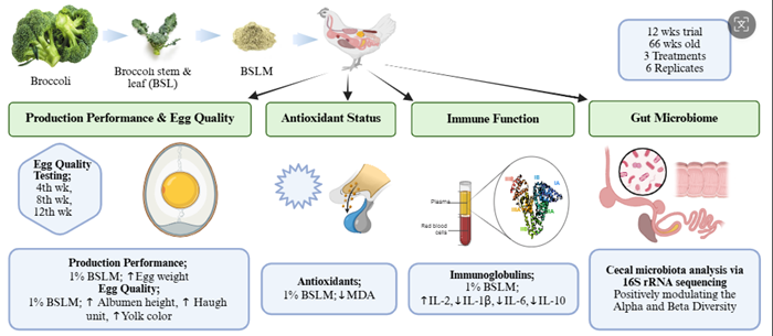 研究团队通过试验发现,在饲料中添加0.5%~1%西兰花茎叶粉,能够显著改善蛋鸡产蛋性能、提升蛋品质,并增强其机体抗氧化能力与肠道健康。研究证实,西兰花茎叶粉有助于提高老龄蛋鸡的营养利用与生理适应能力。该研究为西兰花茎叶等农业副产物的资源化利用提供了新途径,同时为推动蛋鸡健康养殖与可持续发展提供了重要科技支撑。